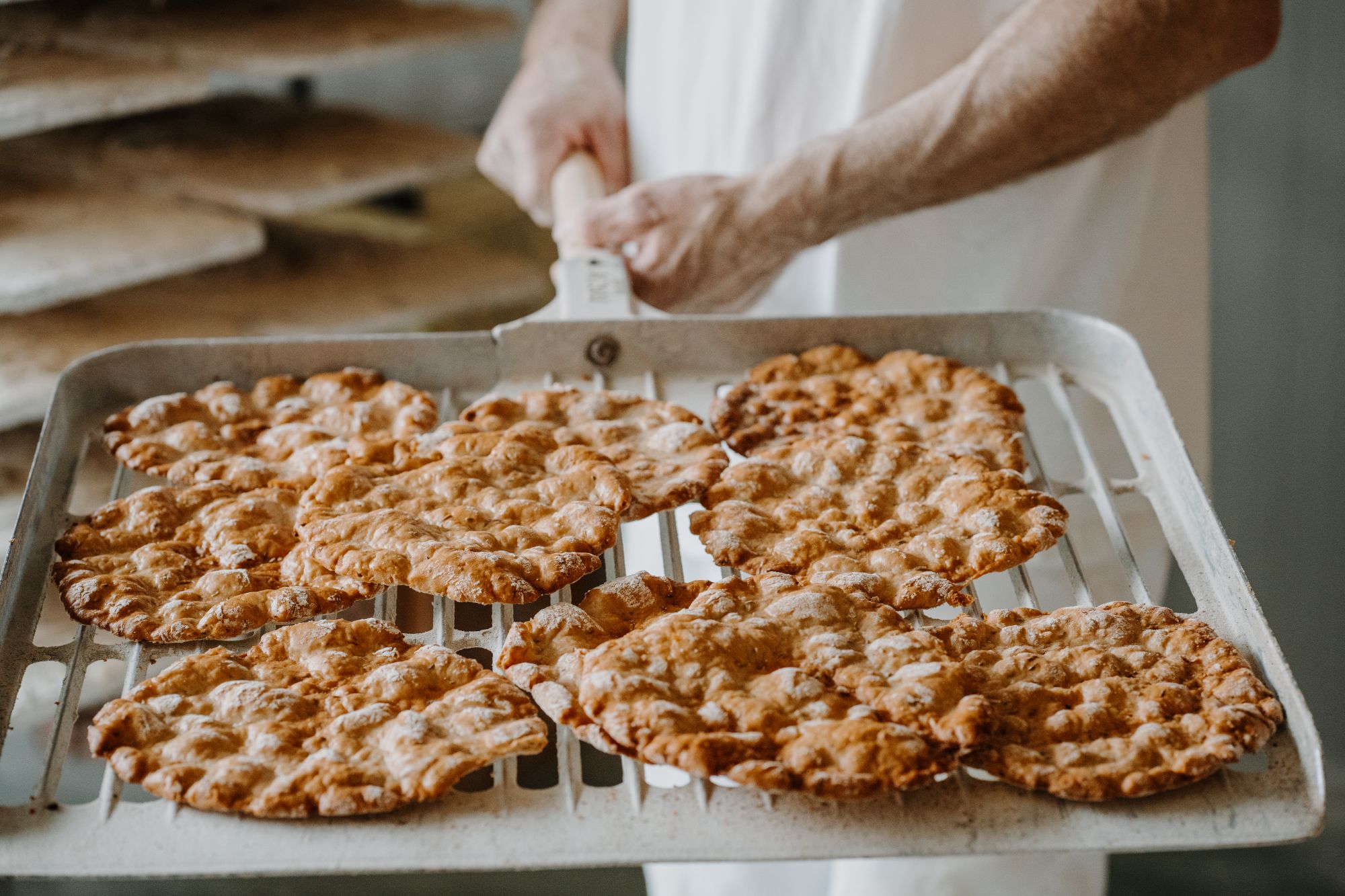 Wie der Name „Schüttelbrot“ schon andeutet, ist einer der Herstellungsschritte das Schütteln des Teigs. Dadurch wird er nach dem Ruhen in die charakteristische, flache Form gebracht. Da der Teig sehr weich und klebrig ist, lässt er sich weder mit den Fingern flachdrücken noch ausrollen. Sich diese Schütteltechnik anzueignen und sie zu perfektionieren, dauert übrigens ganz schön lange.