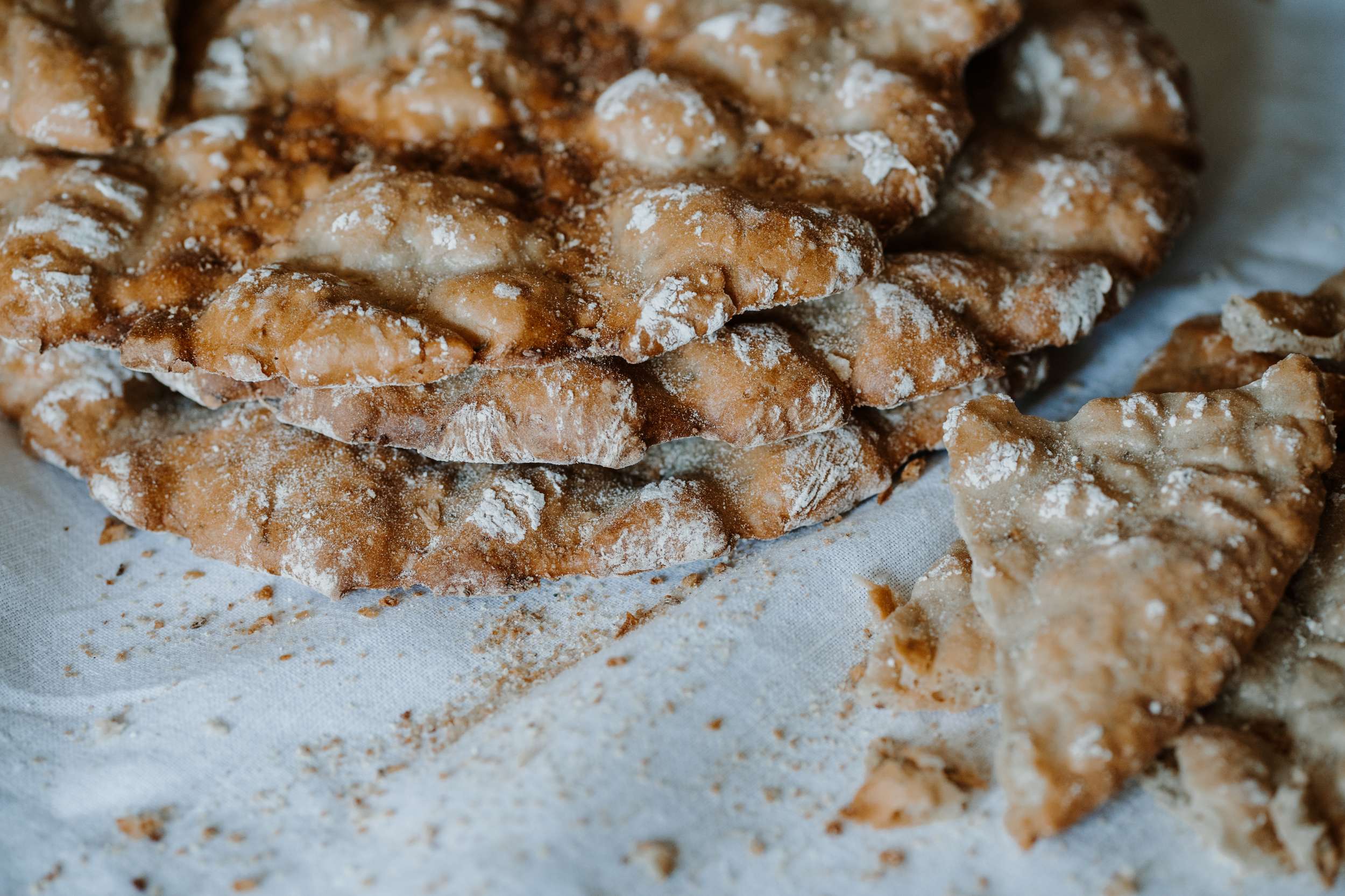 Schüttelbrot croccante spolverato di farina, con alcune fette spezzate su un telo chiaro.
